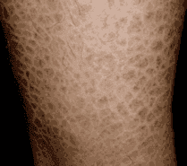 3、性连锁隐患性鱼鳞病:较少见。出生时或出生后不久发病,但仅见男性。皮损似上述寻常型鱼鳞病。但分布可遍及全身,亦可累及面部及四肢屈侧,唯无掌跖角化,且不随年龄增长而减轻。